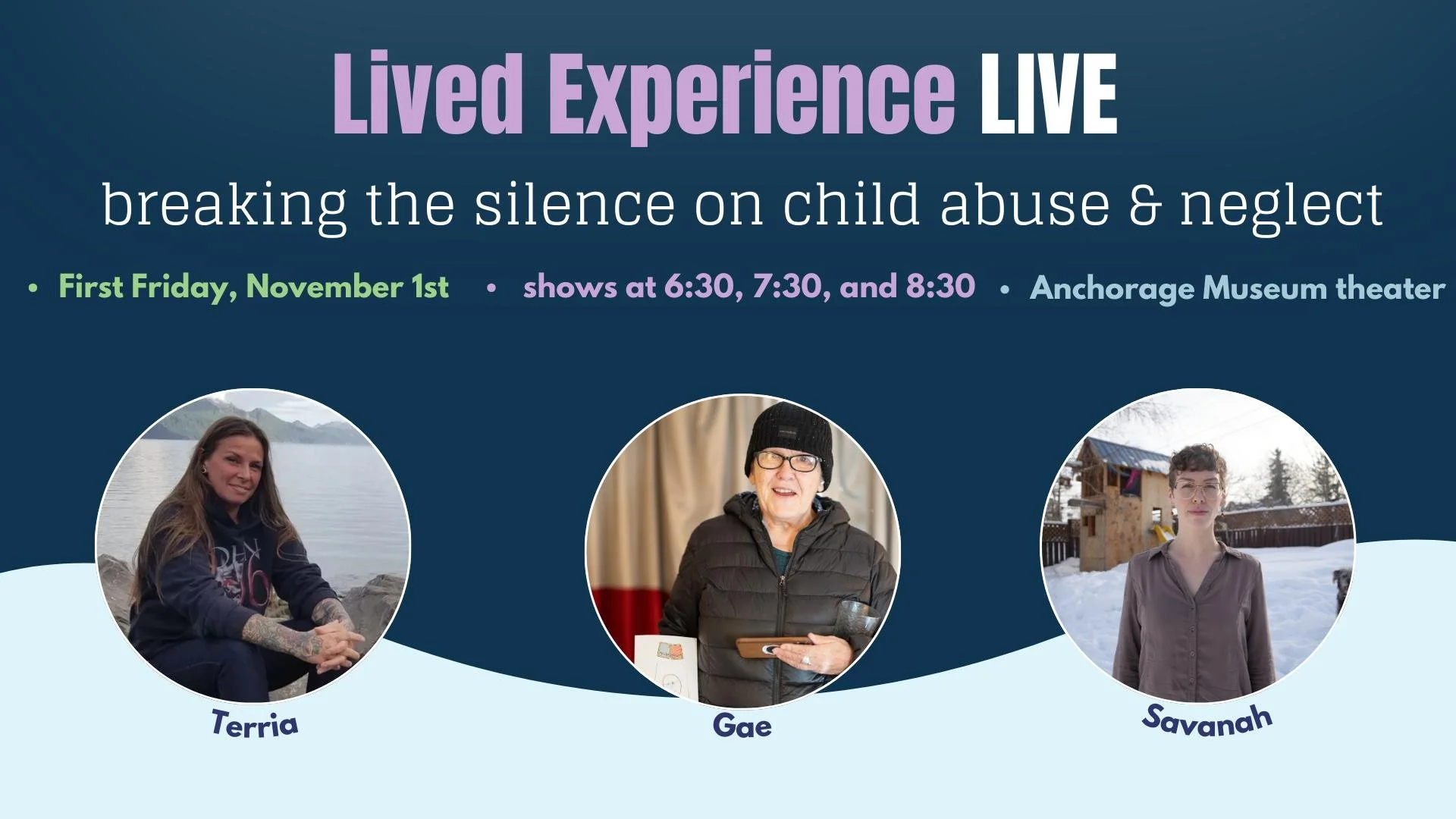 Join us for First Friday on November 1st at the Anchorage Museum theater for Lived Experience: Breaking the Silence on Child Abuse and Neglect, a powerful evening of storytelling hosted by Alaska Children's Trust. We’ll premiere four videos of Alaskans sharing their stories about child abuse and neglect, healing, and breaking the silence.